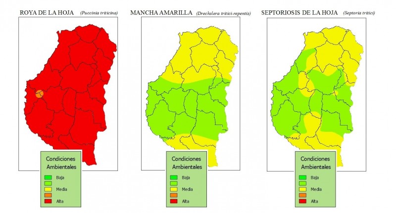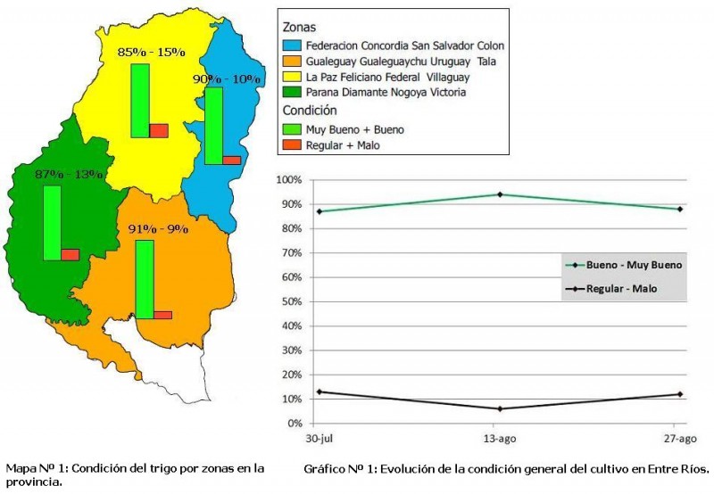 Los cultivos de trigo monitoreados en los Dptos. Paraná, Diamante, La Paz, Villaguay y Victoria (24 y 25 de agosto de 2015) fenológicamente se encuentran entre EC13 (tres hojitas) y EC55 (mitad de espiga visible). En general, el estado sanitario en relación a las enfermedades, en lotes bajo rotación con maíz es muy bueno con presencia a nivel de trazas de mancha amarilla (Drechslera tritici-repentis) y roya de la hoja (Puccinia triticina). En el Dpto. Gualeguaychú los trigos en estado de macollaje a encañazón se encuentran en buen estado, sin embargo algunos cultivares susceptibles presentan niveles altos de roya de la hoja y mancha amarilla. Lo mismos ocurre en los Dptos. Nogoyá y La Paz, según la información brindada por asesores técnicos.
