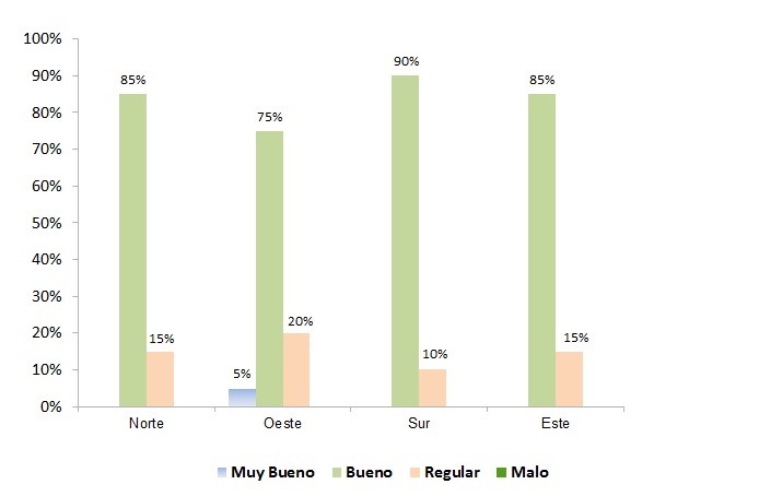Como se puede observar en el Gráfico Nº 1 el 88% del área implantada cuenta con una condición calificada entre buena a muy buena, disminuyendo en 6 puntos porcentuales en relación a lo informado hace dos semanas. En contra partida, se detectó un incremento de 6% en la categoría regular, alcanzando la misma un 12%.
