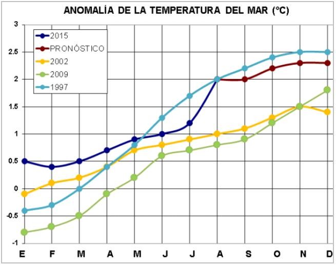Las curvas amarilla (2002) y verde (2009), las dejamos como antecedentes recientes pero debemos destacar que la evolución del presente evento es claramente más intensa que la observada en esas dos situaciones. Puntualizando, a finales de agosto, la anomalía del actual episodio cálido duplica la de sus dos predecesores inmediatos, al tiempo que con un significativo cambio de tendencia logró alcanzar los guarismos que se observaban en 1997.