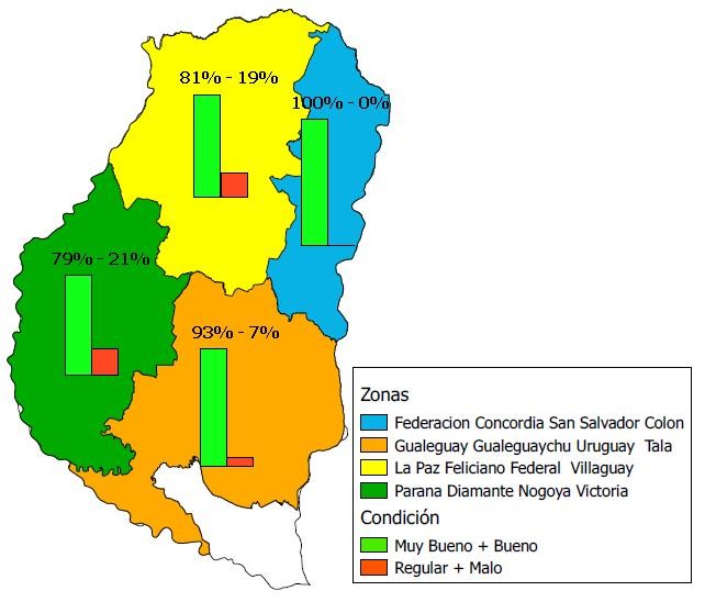 Según datos brindados por los Colaboradores, la condición del cultivo se califica como muy buena en un 31%, 57% buena y un 12% regular. En el Gráfico Nº 1 se muestra la condición por zonas en Entre Ríos.