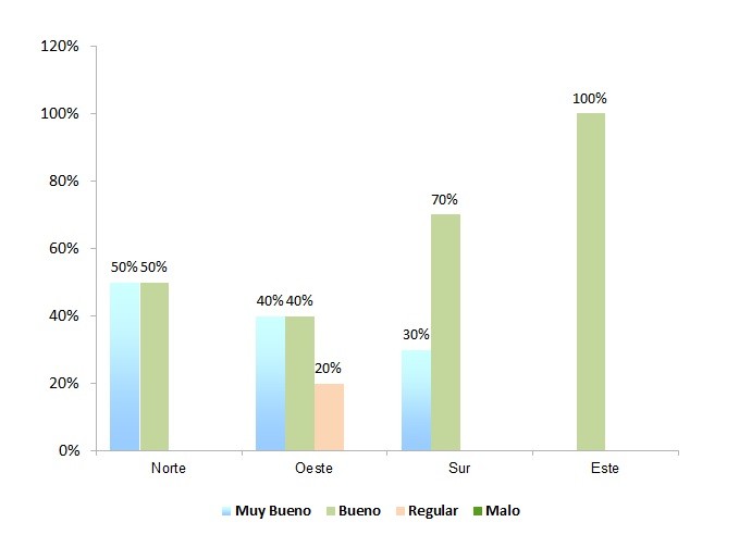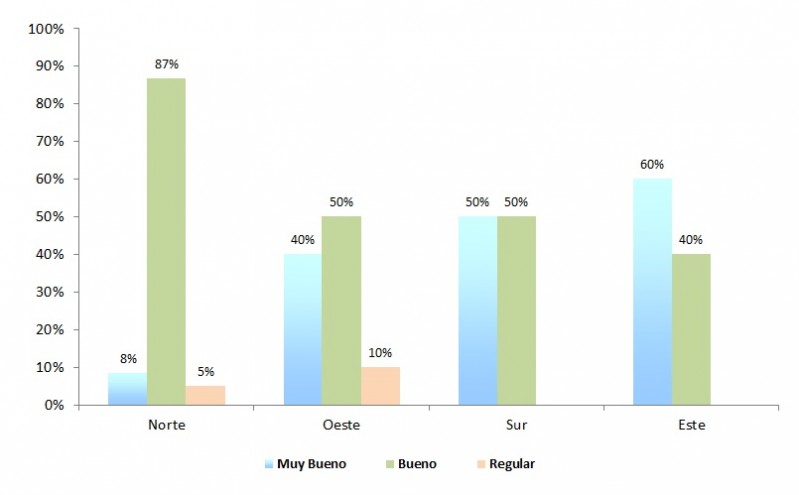 La condición general de la oleaginosa en la provincia no ha mostrado grandes cambios si se lo compara con el último reporte,presentando el 95% del área total implantada una condición calificada desde muy buena a buena y el restante 5% en una condición regular. La condición por zonas se detalla en el Gráfico Nº 2.