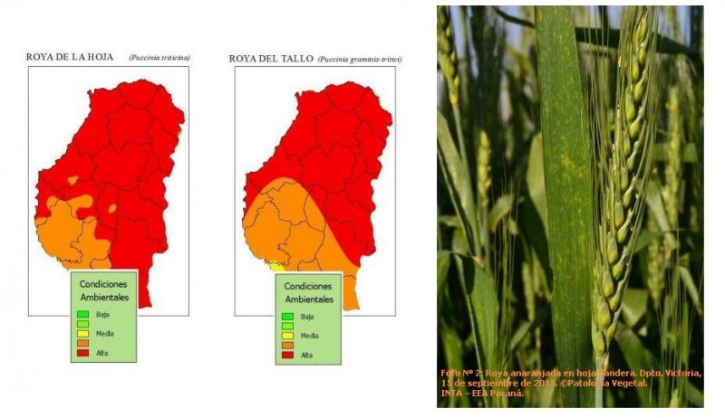 El riesgo climático para la ocurrencia roya de la hoja y desarrollo de las enfermedades del trigo preparado por la Bolsa de Cereales de Entre Ríos, Campo Global e INTA-EEA Paraná para la semana del 08 al 14 de septiembre indica en general un crecimiento moderado de la roya de la hoja (Puccinia triticina) y la roya del tallo (P. graminis-tritici) sólo en variedades susceptibles. Algunas variedades presentan una excelente sanidad a enfermedades foliares.