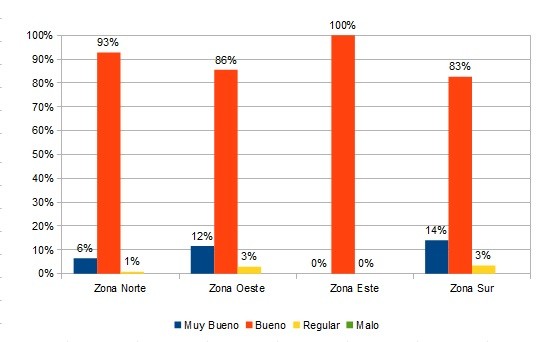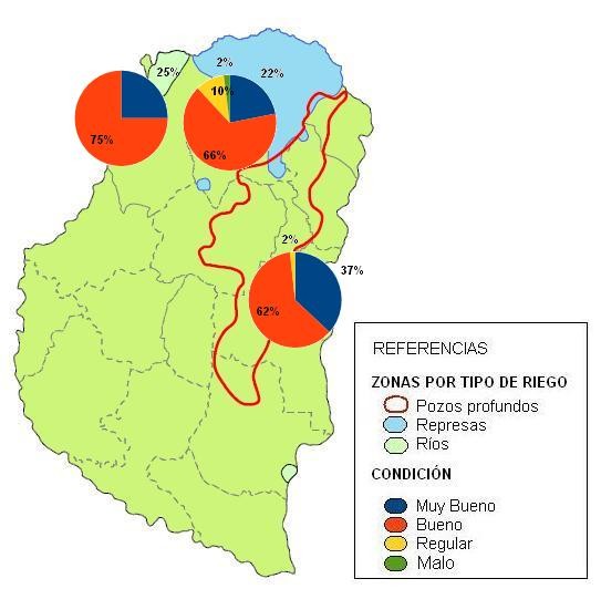 La condición se destaca como muy buena a buena en un 95% de la superficie, 4% regular y el 1% restante calificada como mala. Se observan diferencias con respecto al desarrollo del cultivo en función de la fecha de siembra, los lotes sembrados más temprano muestran poca biomasa y en algunos casos no han cerrado el surco. En el Mapa Nº 1 se muestra la condición por zonas según la fuente de riego.