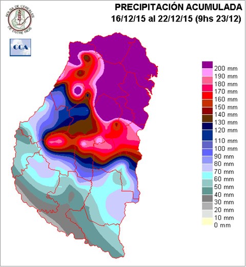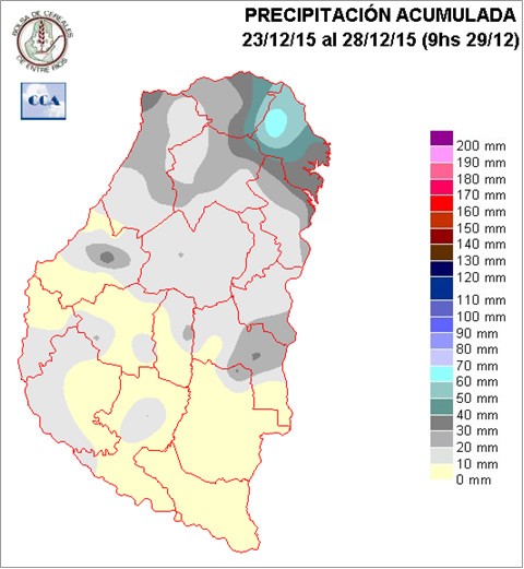 Esta última semana se ha presentado con lluvias muy pobres en la mayor parte del territorio entrerriano. Durante las últimas horas del martes y en la madrugada del miércoles algunas tormentas se vieron favorecidas en el norte entrerriano y es esta la zona donde se concretaron las lluvias de mayor importancia. Este sistema de mal tiempo evolucionó hacia el norte y hacia el oeste, tomando zonas del sur y este de Corrientes, norte de SF y luego Chaco. Por la dinámica que adquirieron las tormentas, la rama más activa de este sistema de mal tiempo no prosperó hacia el sur de la provincia y si bien se observaron algunos chaparrones locales que lograron quebrar la barrera de los 10 milímetros, las coberturas nubosas no lograron el desarrollo suficiente como para que se den precipitaciones de mayor porte en forma generalizada. Teniendo en cuenta esto, los registros pluviales que predominan son inferiores a los 5 milímetros. Esta oferta de agua sólo basta para compensar un solo día de evapotranspiración y consecuentemente la afectación negativa del balance hídrico es elemental a lo largo de estos últimos siete días.