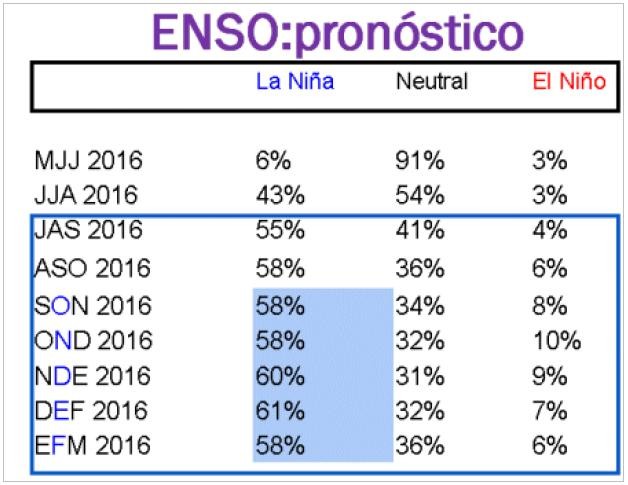 A partir del mes de agosto la probabilidad comienza a inclinarse a favor de un progresivo afianzamiento del fenómeno La Niña. Este enfriamiento será débil.