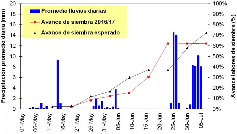 Los Colaboradores reportan que es muy probable que hacia el fin de semana se reanuden las actividades, pero es importante destacar el que normalmente luego del 20 de julio son pocos los productores que optan por cultivar trigo y si las precipitaciones se hacen presentes nuevamente se convertirían en un factor de alto impacto negativo para que se concrete la intención de siembra original.