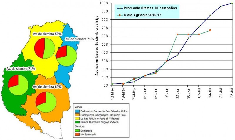 A nivel provincial se ha concretado el 67% de la intención original, con el agravante de que restan escasos días para la finalización de julio y en la medida que transcurren los días se reduce el número de productores que están decididos a implantar trigo en fechas posteriores al 20 del mes en curso.