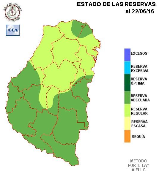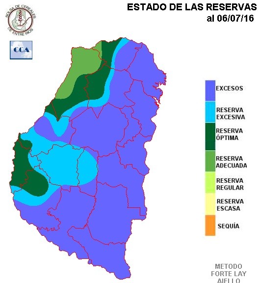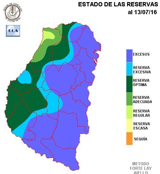 Como podemos observar, no han sido necesarias precipitaciones destacadas como para que los excesos hídricos se sostengan en gran parte del territorio entrerriano. La franja oeste presenta una disponibilidad hídrica más optimizada siendo muy poco representativas las zonas que no cuentan con reservas adecuas. El noroeste de la provincia es la zona que arrastra un patrón relativamente más ajustado, pero que igualmente no puede considerarse del todo ajeno a lo esperado para la zona y la época.