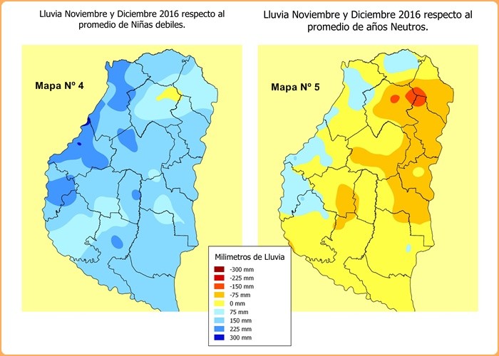 Con estos datos y para dar una mejor comprensión, se exponen a continuación los mapas Nº 4 y Nº 5, para concluir si la presente campaña se esta comportando como una niña debil, en cuanto a los valores de las precipitaciones en los meses de Noviembre y Diciembre.
