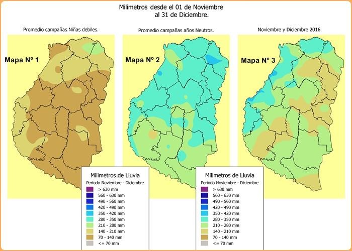 En el mapa Nº 1, donde se incluyeron las campañas: 2005/06, 2008/09 y 2011/12, que tuvieron comportamiento de «Niña débil», se puede observar que las precipitaciones promedio se ubicaron dentro de un rango que va de 70 mm a 140 mm, con un sector marcado al NE de la provincia que supero los 200 mm.