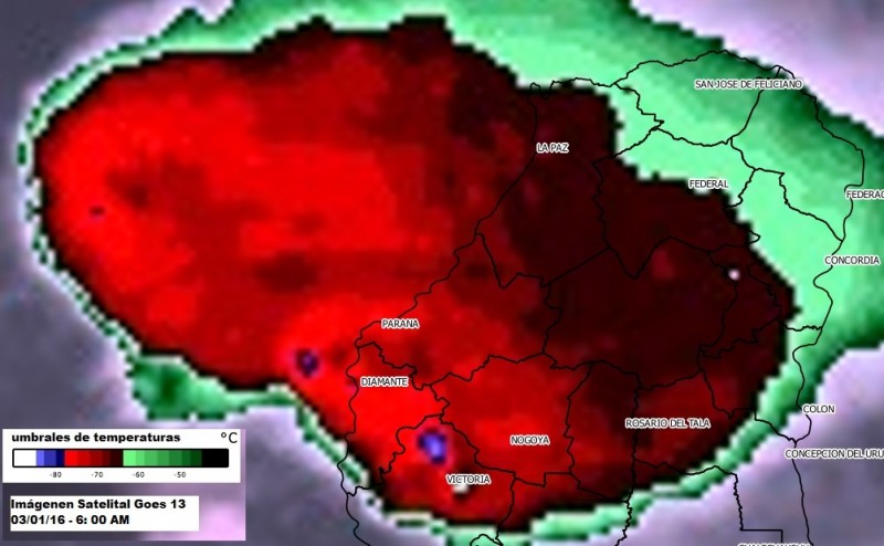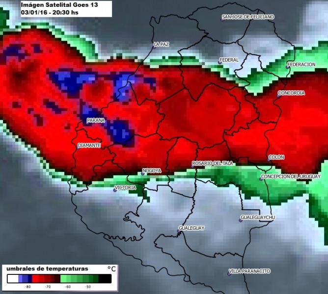 Las imágenes del satélite GOES -13, muestran las zonas donde el temporal fué de mayor intensidad (tonos azules).
