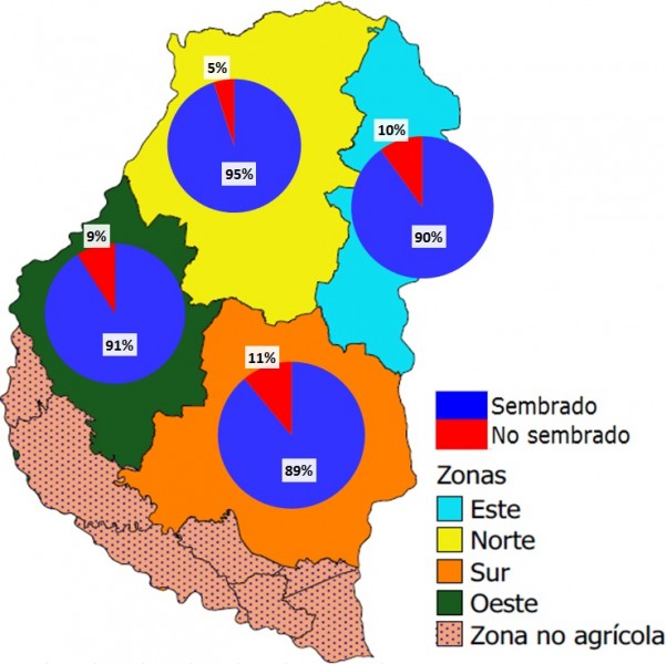 La zona Sur es la que mayor retraso presenta con un 89 % (Figura 1), la cual abarca los departamentos Gualeguay, Gualeguaychú, Tala y Uruguay. Es importante mencionar que la zona Sur en la campaña 2016/17 fue la que mayor área dedicó al cultivo de maíz de primera.