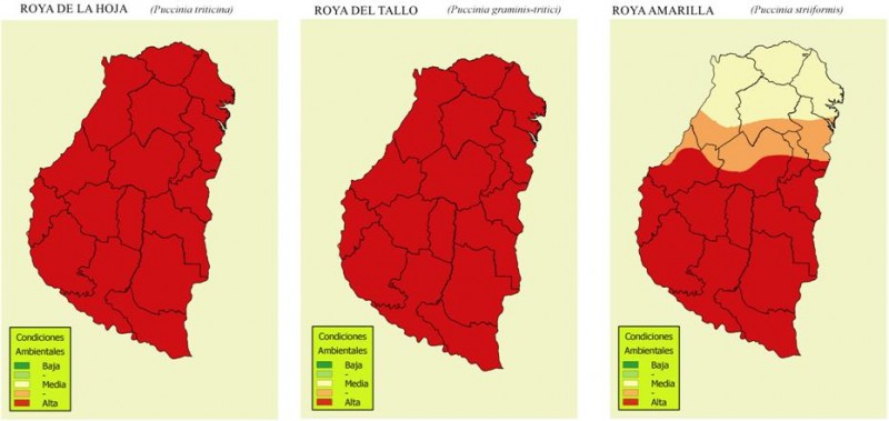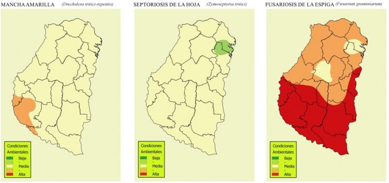 El trabajo conjunto de técnicos de la Bolsa de Cereales de Entre Ríos (Ings. P. Fontanini y F. Galizzi), Campo Global (Ings. E. Cabrera, P. Glagovsky y N. Ríos) y del Laboratorio de Patología Vegetal (Ings. N. Formento y H. Mainez) del INTA-EEA Paraná permite ofrecer el riesgo climático semanal para las enfermedades del trigo en la provincia de Entre Ríos.