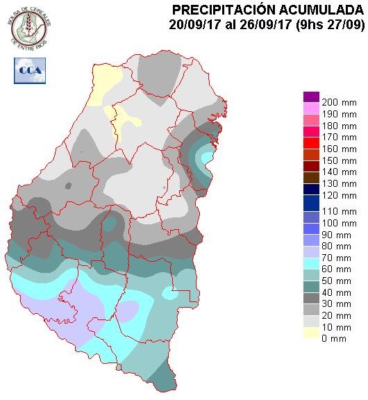 Las últimas jornadas del mes de septiembre se desarrollaron bajo condiciones de inestabilidad, con ambiente cálido y vastas coberturas nubosas. Estas circunstancias impusieron un ritmo de lluvias débiles y lloviznas que se fueron alternando espacialmente hasta llegar a su apogeo durante la madrugada del domingo, momento en que se observaron los acumulados que engrosan los totales que muestra el mapa. Durante el resto del domingo y aún parte del lunes continuaron observándose lluvias ligeras y lloviznas. Desde entonces ha dejado de llover en la provincia, sin embargo las coberturas nubosas se han mostrado persistentes.