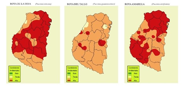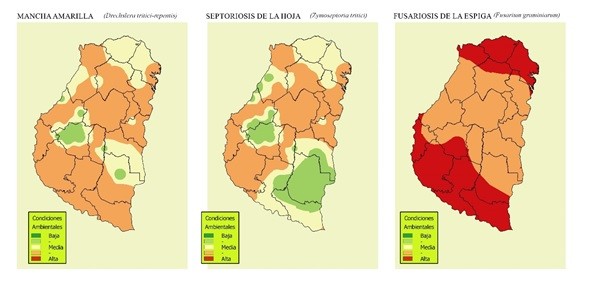 La Bolsa de Cereales de Entre Ríos (Ings. P. Fontanini y F. Galizzi), Campo Global (Ings. E. Cabrera, P. Glagovsky y N. Ríos) y el Laboratorio de Patología Vegetal (Ing. N. Formento) del INTA-EEA Paraná ofrecen los Mapas N° 1 y N°2 de riesgo climático para las principales enfermedades del trigo en la provincia de Entre Ríos. La mayoría de los lotes de producción se encuentran en la etapa de llenado de granos, grano acuoso y pastoso (Z70 – Z80).