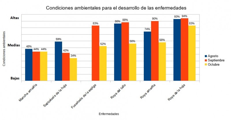Según la escala empleada que asocia factores climáticos y enfermedad, se considera condiciones medias para el desarrollo de una enfermedad cuando los valores se aproximan al 50%, por debajo de este porcentaje se estiman condiciones bajas para la ocurrencia de la enfermedad considerada, y por el contrario, valores superiores al 50%, hasta el 100%, indican condiciones altamente favorables. En los últimos 3 meses, las condiciones ambientales para mancha amarilla y septoriosis de la hoja fueron medias a bajas. Por el contrario, para las tres royas (anaranjada, amarilla y negra o del tallo) las condiciones ambientales fueron de medias a altas, siendo la roya de la hoja la que presentó las mayores condiciones predisponentes.