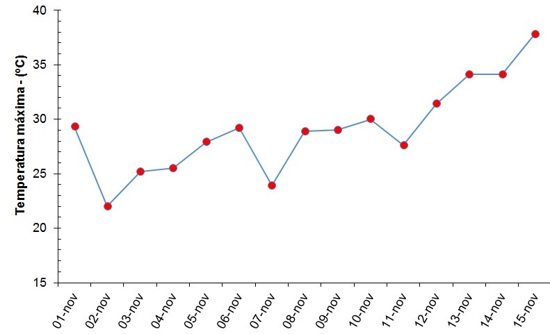 Cabe destacar que desde el 11 al 15 de noviembre se registró un incremento importante de la temperatura (Figura 1). El miércoles 15 el promedio de la temperatura máxima en la provincia de Entre Ríos fue de 37,8 oC, este hecho generó que en algunos sitios se observara síntomas de estrés.