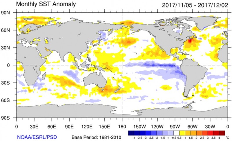 Durante el mes de noviembre el enfriamiento del Pacífico Ecuatorial central se afianzó. La situación oceánica se condice con un evento Niña de intensidad débil. Sin embargo no hay indicadores que evidencien su influencia sobre el comportamiento atmosférico.
