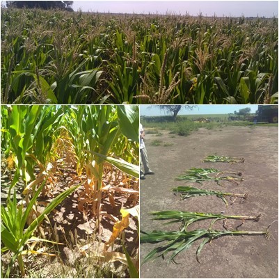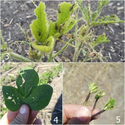 Los colaboradores mencionan que se aprecia daño en las hojas de las plantas por efecto del viento. En relación a los insectos plagas, se han detectado en sitios puntuales daños por tucura y como una rareza en el departamento La Paz en un lote lindero a maíz se encontró un ataquede Megascelis sp. (ver Figuras 3, 4 y 5).