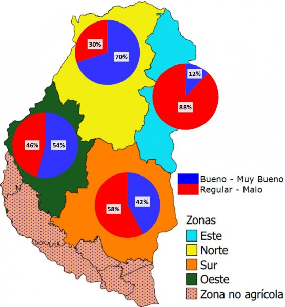 En la Figura 6 se puede apreciar la condición del maíz de primera por zonas. La peor condición detecta en el sector Este como resultado de que en las últimas tres semanas se instaló una situación de sequía.