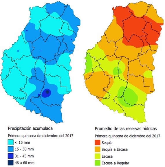La precipitación promedio en la provincia en los primeros 15 días de diciembre fue de 15 mm (es importante recordar que en diciembre el monto total esperado es de aproximadamente 120 mm, ver Figura 1).