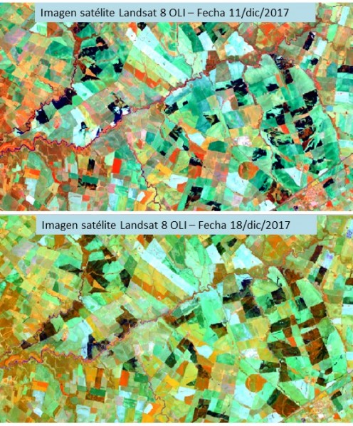 Los colores azules y negros corresponden a lotes donde se están efectuando riegos y el cultivo posee escaso desarrollo. Posteriormente, en la medida en que el arroz aumenta la cobertura del suelo, los colores se cambian hacia anaranjados a rojizos.
