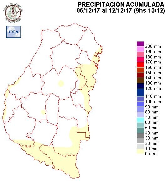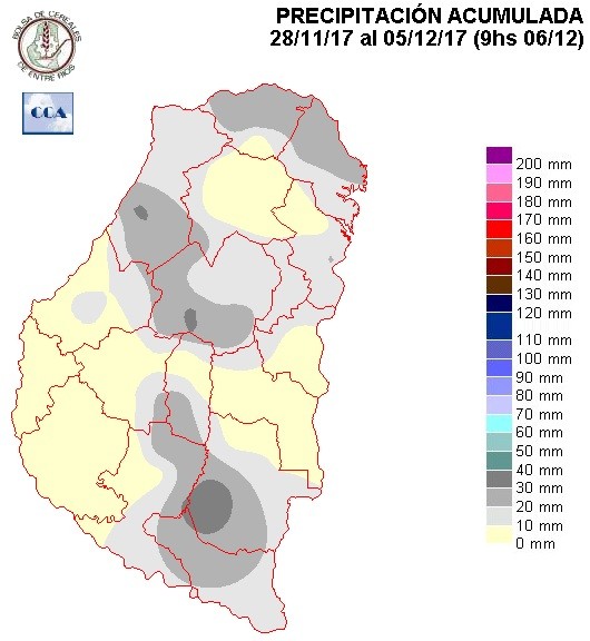 Durante el último fin de semana, se observó el pasaje de un sistema frontal, el cual por sectores, dejó lluvias que pueden considerarse superiores a las previstas. No nos sorprendería a esta altura estar describiendo un mapa en tonos de amarillo generalizado, sin embargo, vemos que sobre el centro oeste vastas zonas recibieron precipitaciones entre veinte y treinta milímetros, configurándose algunos afortunados corredores donde esta barrera fue superada. Contrariamente, aparecen salteos en zonas importantes de los departamentos del sur, donde los registros pluviales no superan los diez milímetros.
