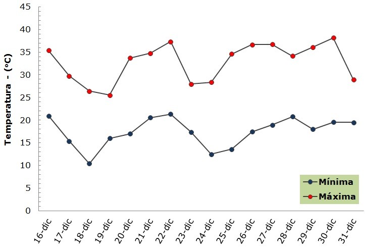 El promedio de la temperatura mínima fue de 17,4 oC, mientras que el promedio de las máximas se ubicó en 32,8 oC, con un promedio de amplitud térmica de 15,3 oC.