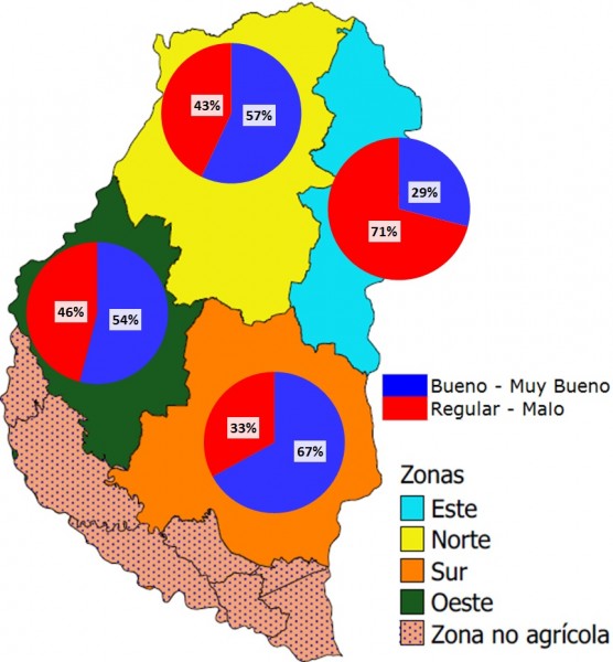 El sector Este padece el peor escenario con el 71 % del área dentro de la categoría de regular a mala. En esta región algunos productores han optado por picar los lotes o destinarlos al pastoreo animal ya que el rendimiento es tan bajo que no justifica el gasto de la cosecha.