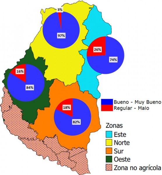 Hasta el momento, la mayor parte del área está afrontando en forma aceptable las escasas lluvias y las altas temperaturas del mes de diciembre. El escenario más complicado se presenta en el sector Este donde el 74 % se ubica en la condición de buena a muy buena, mientras que en el resto del territorio este valor oscila entre el 82 al 97 % (Figura 6).