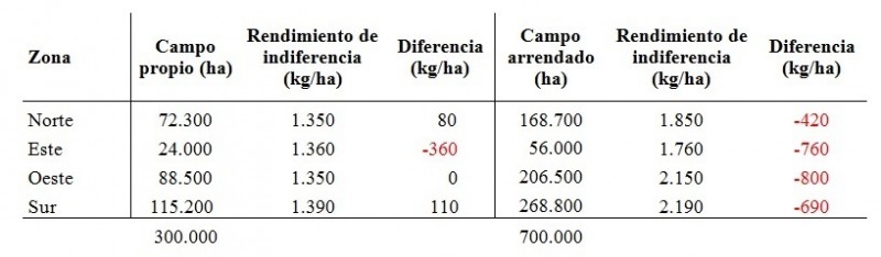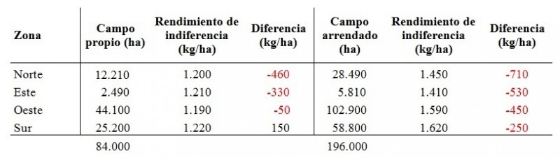 Tabla 2: Superficie sembrada con soja de primera, rendimientos de indiferencia por zona tanto en campo propio y campo arrendado en la provincia de Entre Ríos.