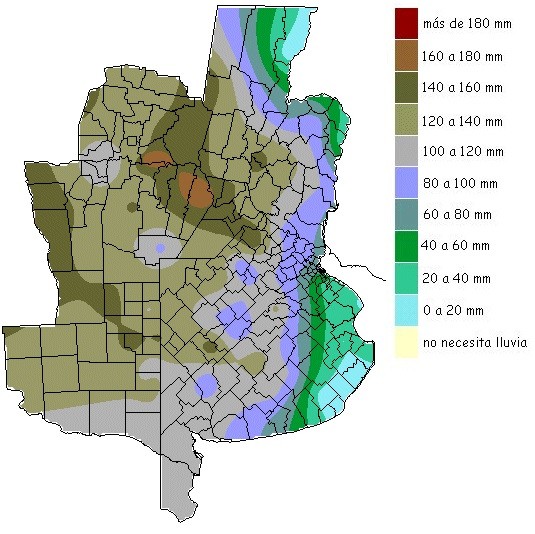 Tomando la condición actual como punto de partida, se puede evaluar cuál es el nivel de precipitaciones necesario como para que las reservas alcancen un nivel adecuado durante las próximas dos semanas. Si bien el mapa es a nivel regional, las conclusiones aplican con criterio al territorio entrerriano.