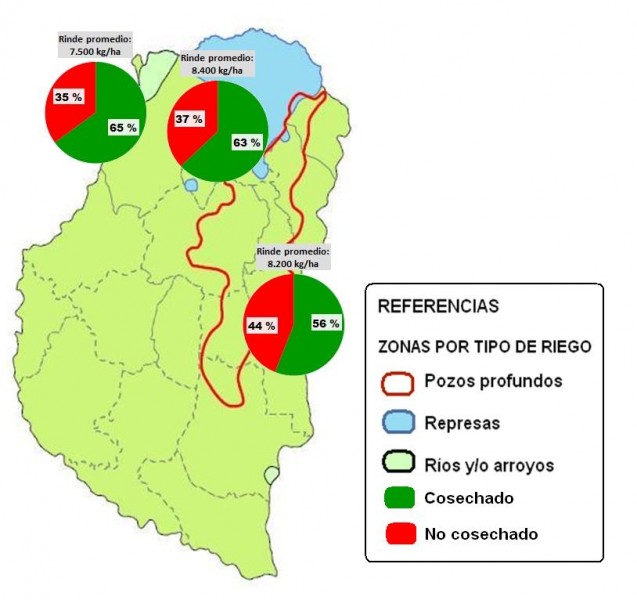 Los colaboradores del sector mencionaron que en general los rendimientos son buenos hasta el momento, sin embargo hay que tener en cuenta que en la zonas de riego por represas hubo lotes que fueron abandonados durante el ciclo del cultivo por la bajante en el nivel del agua de riego que no llegó a abastecer el área implantada.