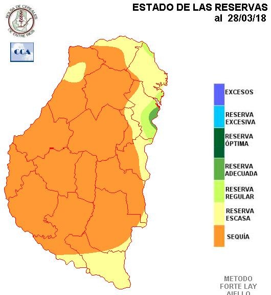 El mapa de reservas de humedad prácticamente no se ha modificado respecto del de la semana pasada. Es imposible que esto suceda con el comportamiento pluvial que acabamos de describir. Notemos que ni en áreas puntuales donde se han registrado algunos chaparrones más generosos, la seca ha cedido.