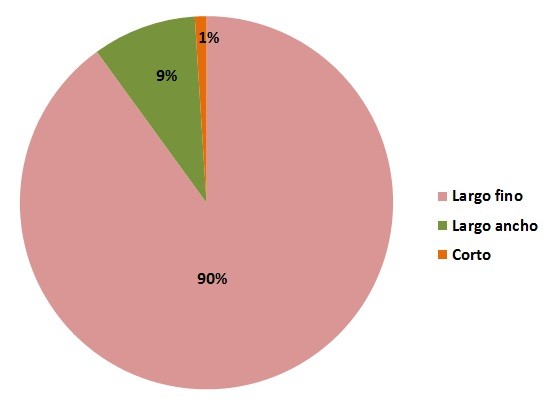 Los resultados para el tipo comercial utilizado, porcentajes de largo fino, largo ancho y corto se detallan en la Figura 1.