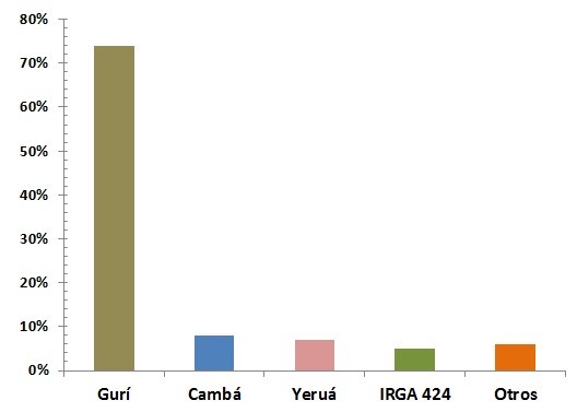 Las variedades más utilizadas fueron: 74 % Gurí, 8 % Cambá, 7 % Yeruá, 5 % Irga 424 y dentro de la categoría otros (6 % restante) se encuentran algunos híbridos y variedades como: Supremo, Puitá, Olimar, Yamaní y Fortuna entre otros (ver Figura 2).