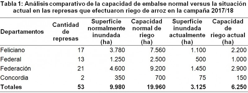 Actualmente las 53 represas involucradas en la campaña 2017/18 tienen un área inundada total de 3.125 ha, mientras que el valor normal sería de 9.980 ha. Por lo tanto, en promedio se encuentran al 31 % de su capacidad y con un área inundada que hoy por hoy permitiría el riego de aproximadamente 6.250 ha. No obstante, este remanente presenta difícil extracción para efectuar el riego y en consecuencia, reduciría aún más la capacidad de riego en la campaña 2018/19.