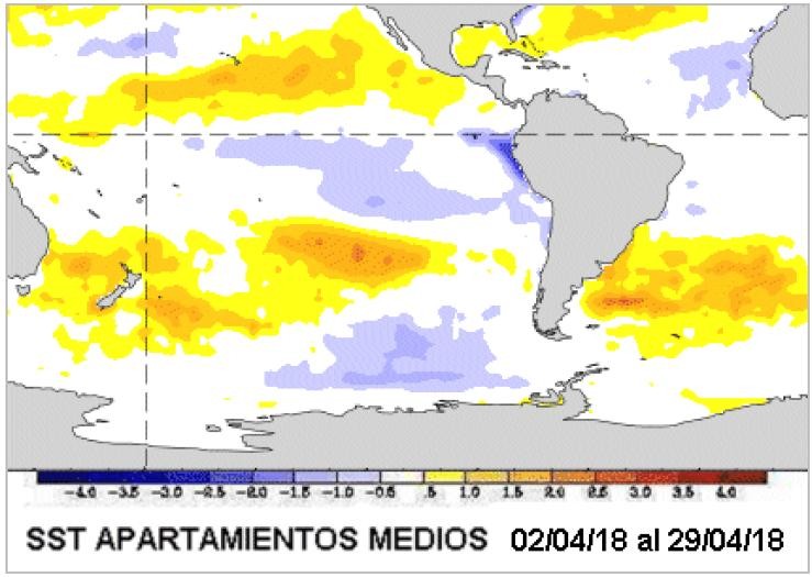 Obviamente lo más destacado que se presenta en el mapa de anomalías de las temperaturas oceánicas superficiales es el resurgir del calentamiento sobre el litoral Atlántico. Como ya hemos visto en los últimos años este tipo de anomalías tiene un impacto significativo sobre el comportamiento pluvial del área continental aledaña y bien pude considerarse fuertemente correlacionado con la rápida respuesta que ha experimentado el patrón pluvial del mes de abril.