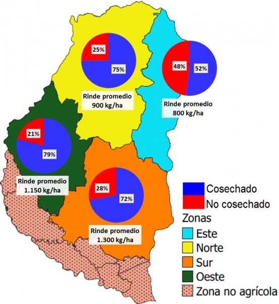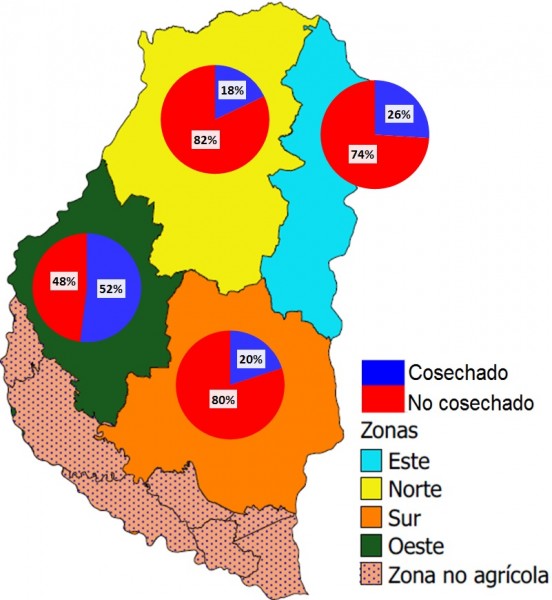 Además se estima que aproximadamente el 2 % (20.000 ha) del área corre serios riesgos de no ser cosechada. Estas hectáreas padecieron: