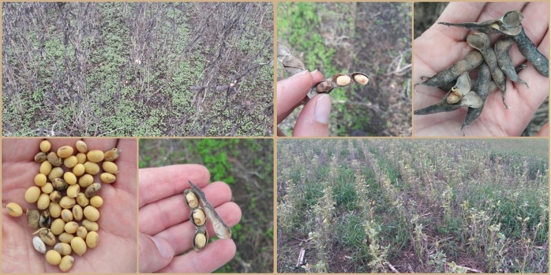 En las siguientes fotografías se puede observar como está afectando el exceso de humedad al cultivo de soja, que dió como resultado la germinación o brotado de las semillas con el cultivo en pie, apertura o dehisencia de vainas y manchas oscuras en vainas que indican la posible presencia de patógenos en las mismas.