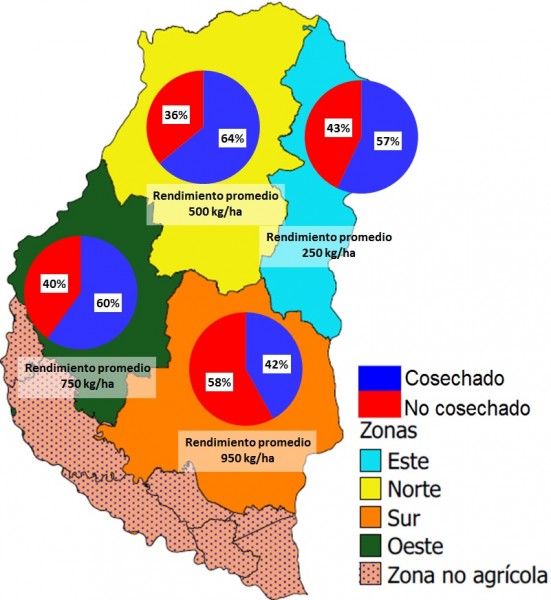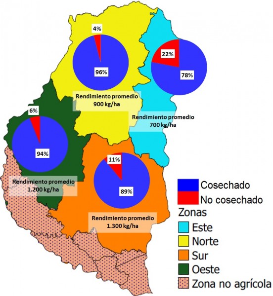 El rendimiento promedio provincial se ubica en 1.100 kg/ha, con un área que no será cosechada de aproximadamente el 2 % (20.000 ha). Los rendimientos promedios por zona más bajos se sitúan hacia el centro Norte del territorio (Figura 1), donde los valores oscilan entre 700 a 900 kg/ha.