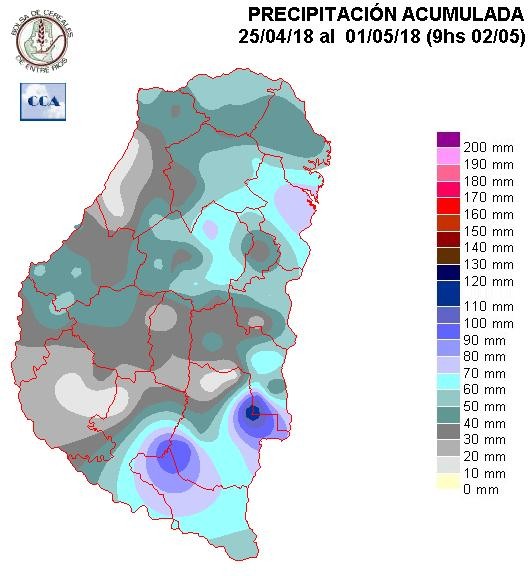 En esta última semana, las precipitaciones sumaron unos pocos milímetros, en algunos departamentos, lloviznas que no dejaron registros. Como mencionamos sobre zonas del sudeste provincial se dieron algunas precipitaciones más intensas, asociadas a un área de inestabilidad que por entonces afectaba el estuario del Río de la Plata y el sur de Uruguay.