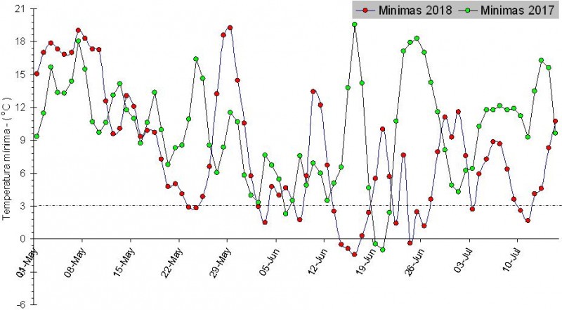 El valor promedio de la temperatura mínima desde mayo a mediados de julio del 2018 se posicionó 2,1 oC por debajo de lo acontecido en el año 2017.