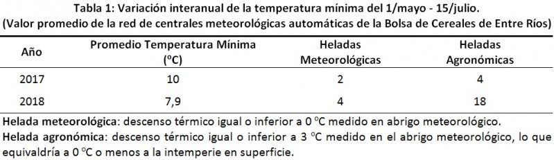 En base a información obtenida de la red de centrales meteorológicas automáticas de la Bolsa de Cereales de Entre Ríos se analizó la variación interanual de la temperatura mínima desde el 1/mayo al 15/julio.