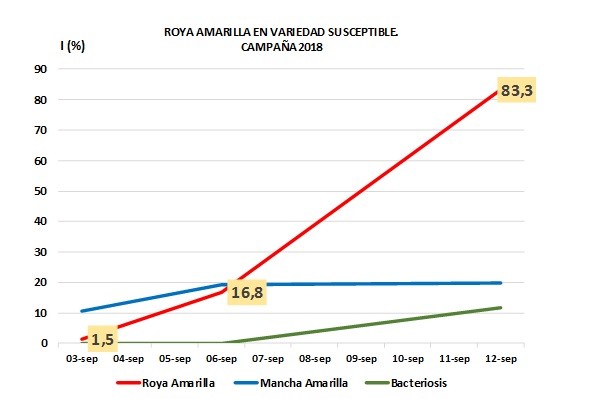 La roya amarilla, se diseminó rápidamente en pocos días sobre una variedad susceptible comparada con la evolución de mancha amarilla (Drechslera tritici-repentis) y bacteriosis en hoja (Figura 2)