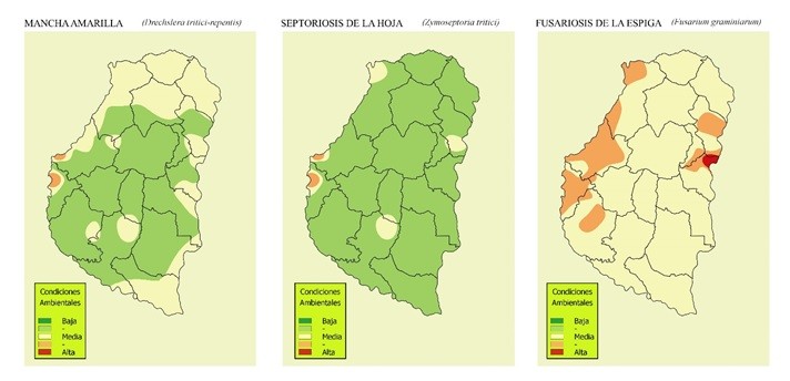 La Bolsa de Cereales de Entre Ríos, Campo Global y Laboratorio de Patología Vegetal del INTA-EEA Paraná (Ing. Agr. Norma Formento) brindan información actualizada acerca de la sanidad de los cultivos de trigo y los mapas de riesgo climático para la ocurrencia de las enfermedades foliares y de la fusariosis de la espiga.