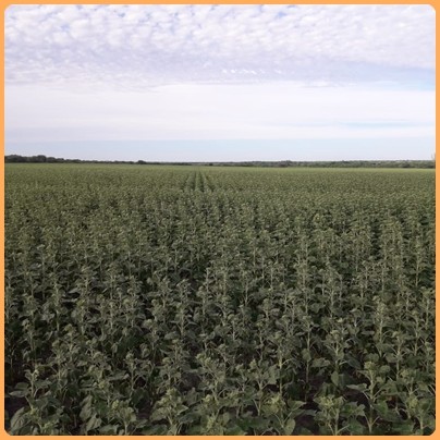 La fenología es variable de acuerdo a la fecha de siembra. Hay lotes con 5 centímetros (cm) de altura, que en base a la escala fenológica se denomina V3 (tres pares de hojas expandidas), hasta lotes que presentan el botón floral con una altura de 60 cm. Figura 3.