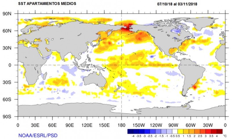 Como puede observarse en el mapa, el corredor central del Pacífico Ecuatorial se promedia con temperaturas superficiales superiores a las normales en las últimas cuatro semanas (07/10/18 al 03/11/18). La anomalía supero la barrera de neutralidad en más de medio grado. Esto ya confirma los escenarios que se anticipaban como más probables en el mes de agosto y no se espera que esta tendencia se modifique al menos hasta abril del año próximo. También es menester recordar que está previsto que este evento tenga una intensidad débil, por lo cual las condiciones de escala regional seguirán siendo muy relevantes y marcando el paso pluvial de la zona.