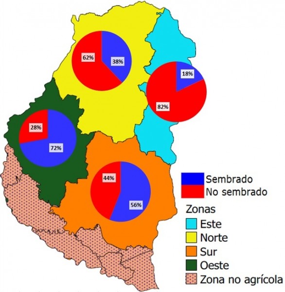 Por un lado la zona oeste lleva un mayor avance direccionado por el nivel de reservas óptimos al momento de la siembra y en contraste la zona este, donde la siembra se inició luego de las lluvias ocurridas la semana pasada, ya que en estos departamentos practicamente las reservas eran escasas.