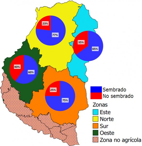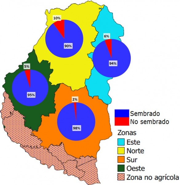 En la Figura 2 se muestra el avance por zonas. El sector Oeste presenta el menor avance con el 60 %, no obstante, este sector abarca aproximadamente el 48 % de la superficie destinada a la soja de segunda.